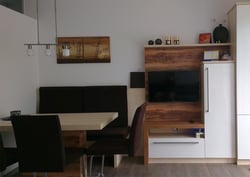 Kleiner Wohnzimmerverbau mit Kleiderschrank, neuem Flat TV mit Sat – Receiver und WLAN Internet.
